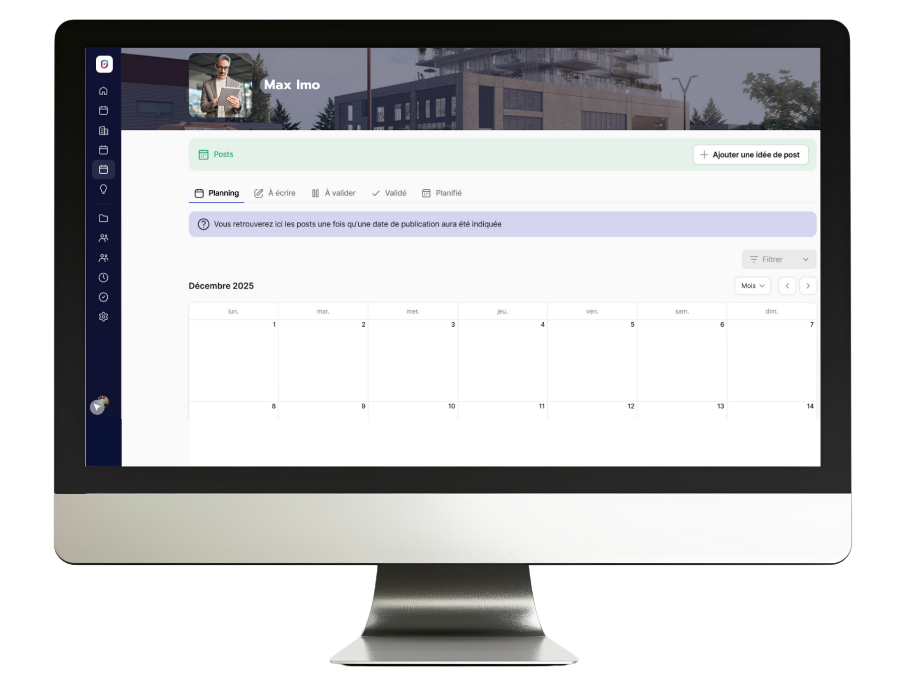 Réseaux sociaux : gestion des idées de posts, validation, planification et intégration au calendrier.